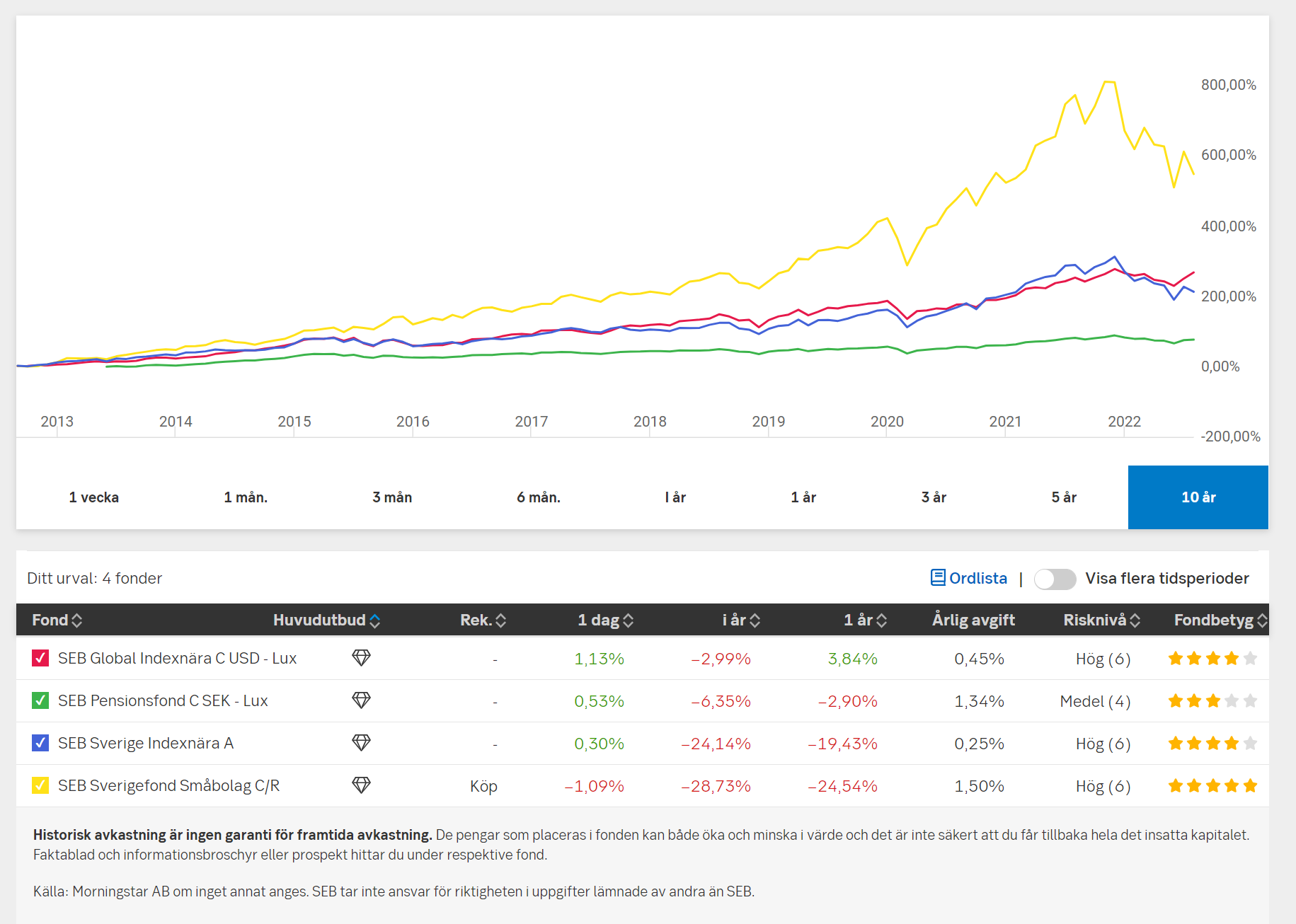 Jag hade precis som killarna sagt bytt till SEB Global indexnära, men hade även lagt på en skvätt svenska fonder. Antingen Sverige indexnära eller om du vill doppa tårna i sanden i en småbolagsfond så är SEB Småbolag C/R ett alternativ.