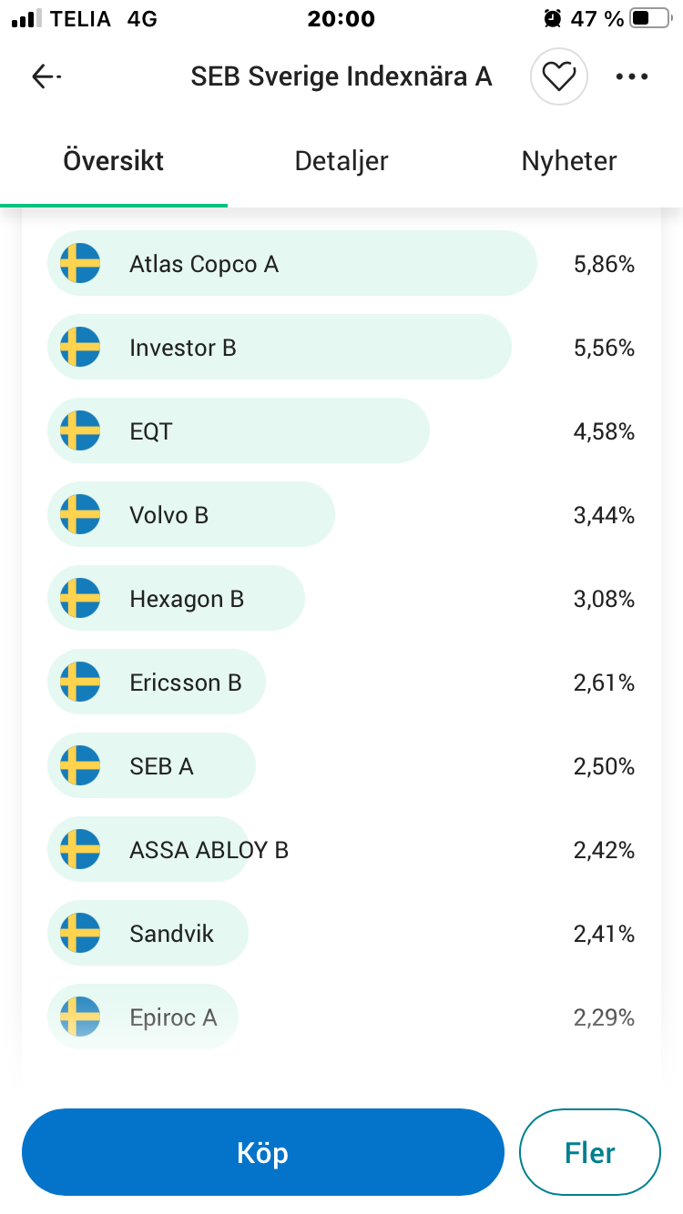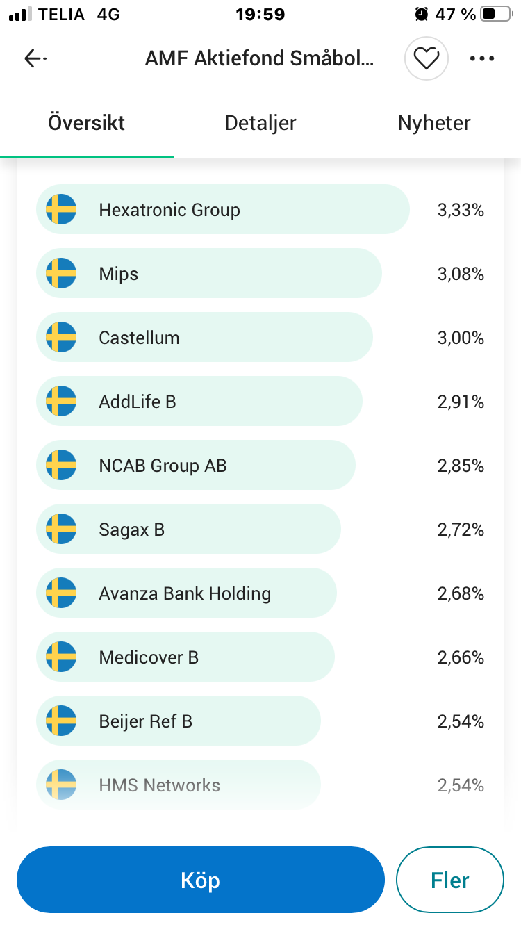 Har i nuläget ca 14% i Seb sverige Indexnära. Har följt trådar här på forumet om småbolagsfonders vara eller inte vara i ens portfölj. Har försökt hitta info om småbolagen som finns med i seb fonden men inte lyckats. Bör man komplettera med en småbolagsfond som en krydda i portföljen? Har kikat lite på amf och plus index . Båda likvärdig i avgift. Hur har ni gjort?