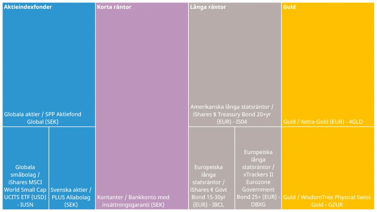 50% globala aktier inkl. Em, 25 % guld fysiskt backat och 25% likvid på räntenivåer 1%+ med insättningsgaranti.