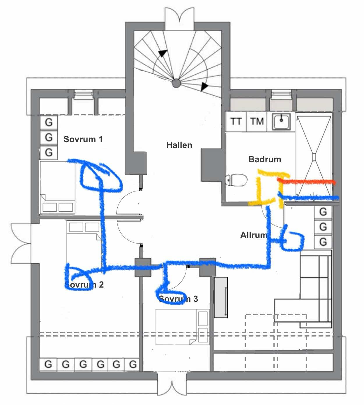 FTX eller liknande hade såklart varit trevligt, men det är inget som går att dra i det här huset. Och att bara ha det på en våning verkar snarare kunna ställa till det mer, som jag förstått det. Huset är ju från 1897, så det var nog inte direkt byggt med såna system i åtanke. Och utanpåliggande rör… nja, känns som det bara funkar om man är ute efter industrilokal-look