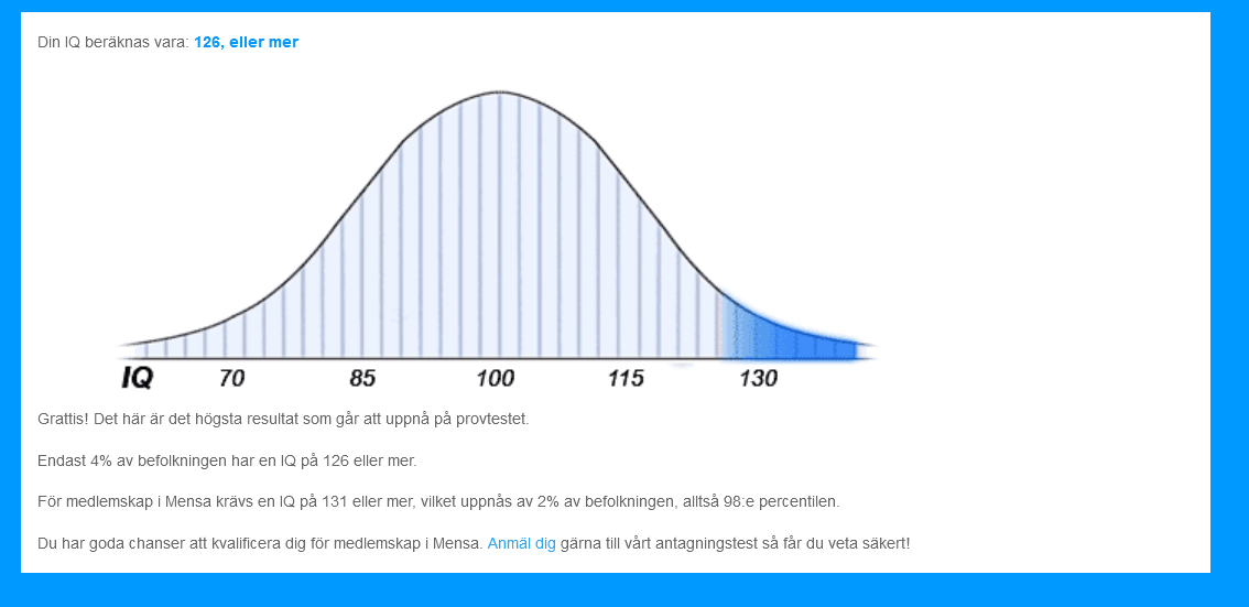 Gjorde ett test på mensa.se nu, tror jag fick alla rätt men är inte säker. Någon som är med i mensa som kan göra det och se om det går att få högre än “126 eller mer”? Och även kanske printa svaren innan man rättar så kan jag se om det stämmer överens med mina.