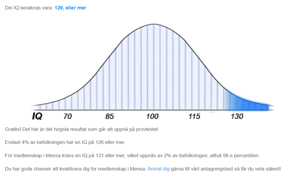 Jag tror dock att ni är ett ganska bra tvärsnitt på befolkningen och det här är vad gemene man tror IQ är, så är inte ute efter att förolämpa någon. Men det är helt klart en uppförsbacke att försöka argumentera för vad IQ-test egentligen är och vad dom har använts till, så jag kommer definitivt inte göra det här men man kan alltid hoppas att någon lägger lite tid för att förstå vad det är. Men människoapan älskar svart/vita förklaringar och framförallt verkar det extremt lockande med ett nummer för ens ”intelligens” det i sig säger ju väldigt mycket om personens intelligens egentligen när man tänker efter.