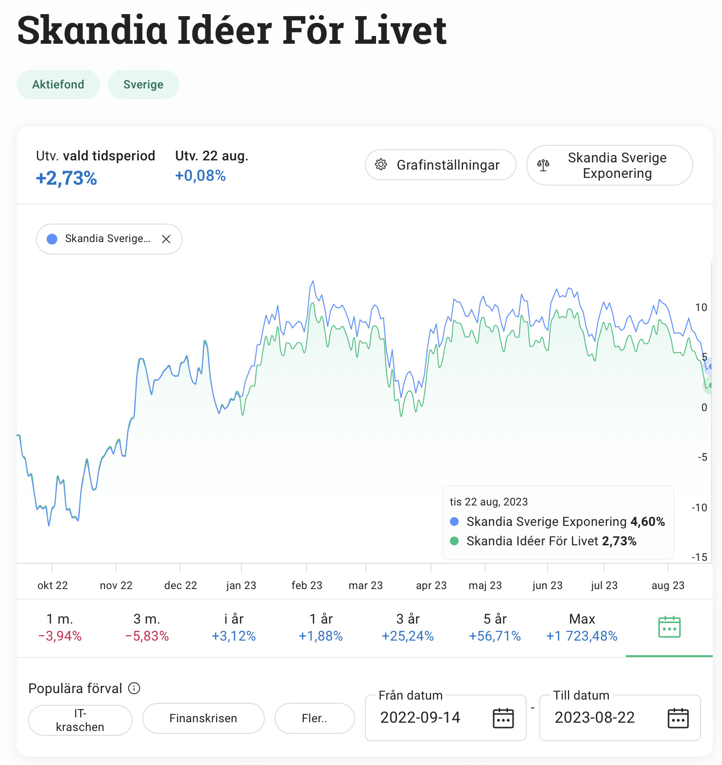 14 September 2022 bytte de till Skandia Sverige Exponering som mottagarfond. Inte jätteöverraskande har Skandia Idéer För Livet gått 2% sämre än Skandia Sverige Exponering sen dess.