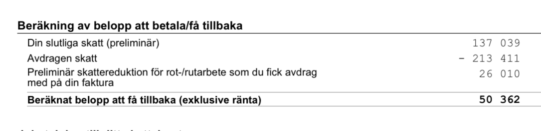 Skattereduktion för förvärvsinkomst: -924 Skattereduktion för Rot/Rut: -10.000