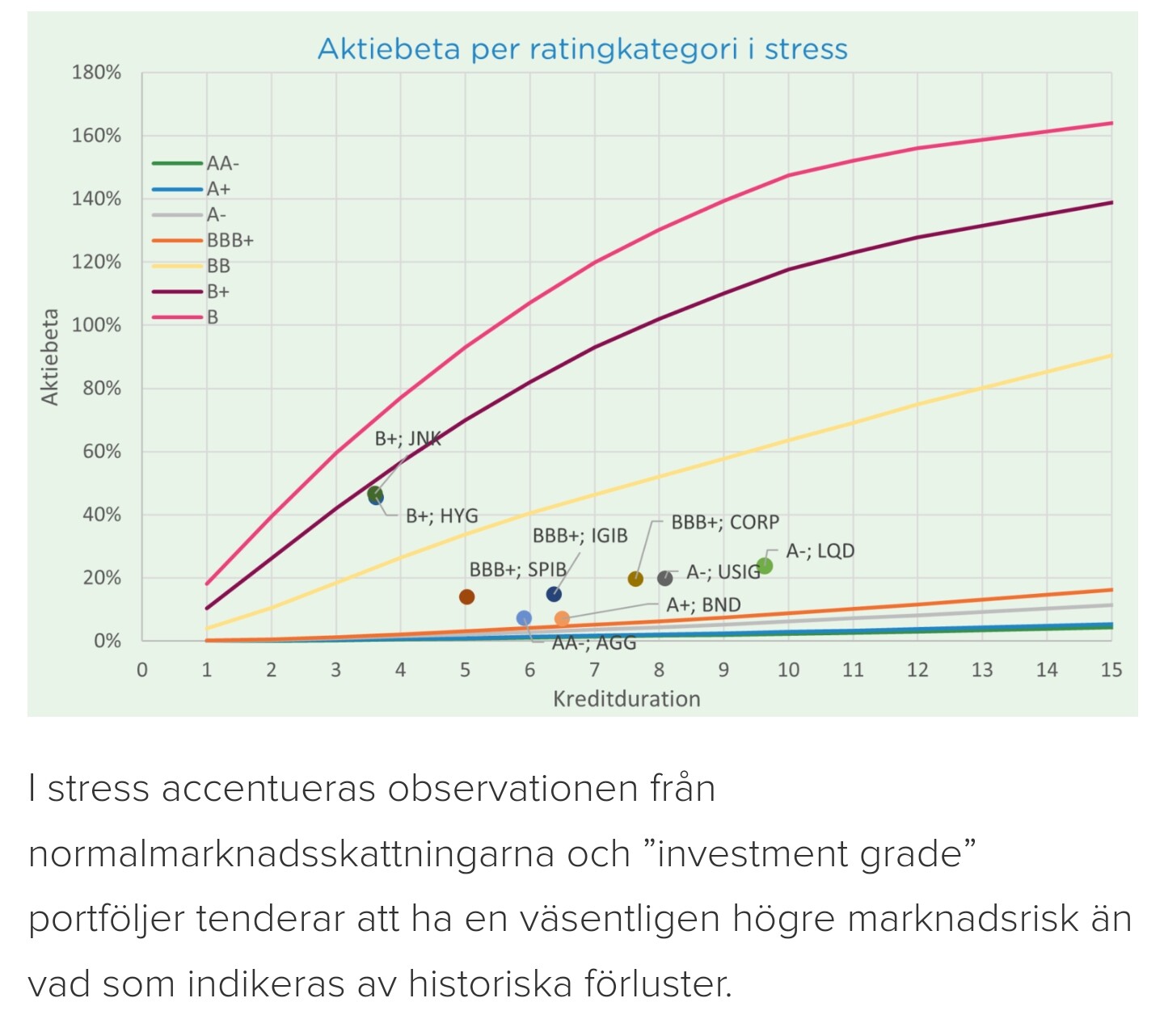Avanza Ränta Global(ingen månadsrapport finns, uppskattar snittkreditbetyg ~BBB = vinröd linje, kreditduration ~6 år) borde ha ett aktiebeta runt 25%. Så om börsen faller 50% faller den 12,5%.