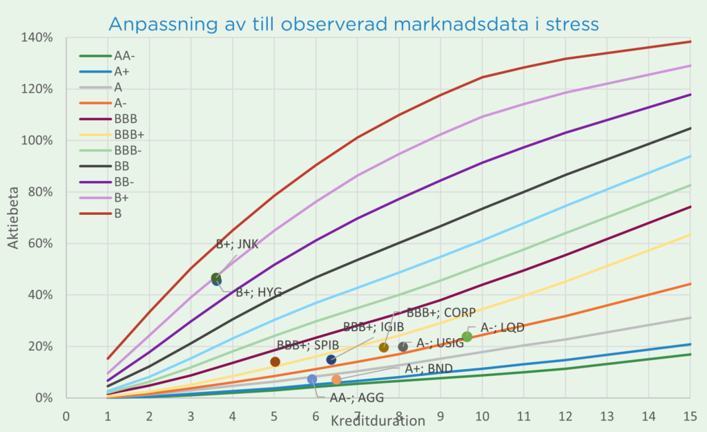 Vi tar fram en modell för skattning av aktiebeta som förklaring till spreadrisk i företagsobligationer baserat på likvida börshandlade amerikanska ETF’er. Modellen syftar till att, via rating, kreditduration och ränteduration, ge en fingervisning om risken i en företagsobligationsportfölj för vilken det saknas marknadsdata av hög kvalitet. Modellen bygger på att lejonparten av risken i portföljen kan attribueras till aktie respektive ränteriskfaktorer.