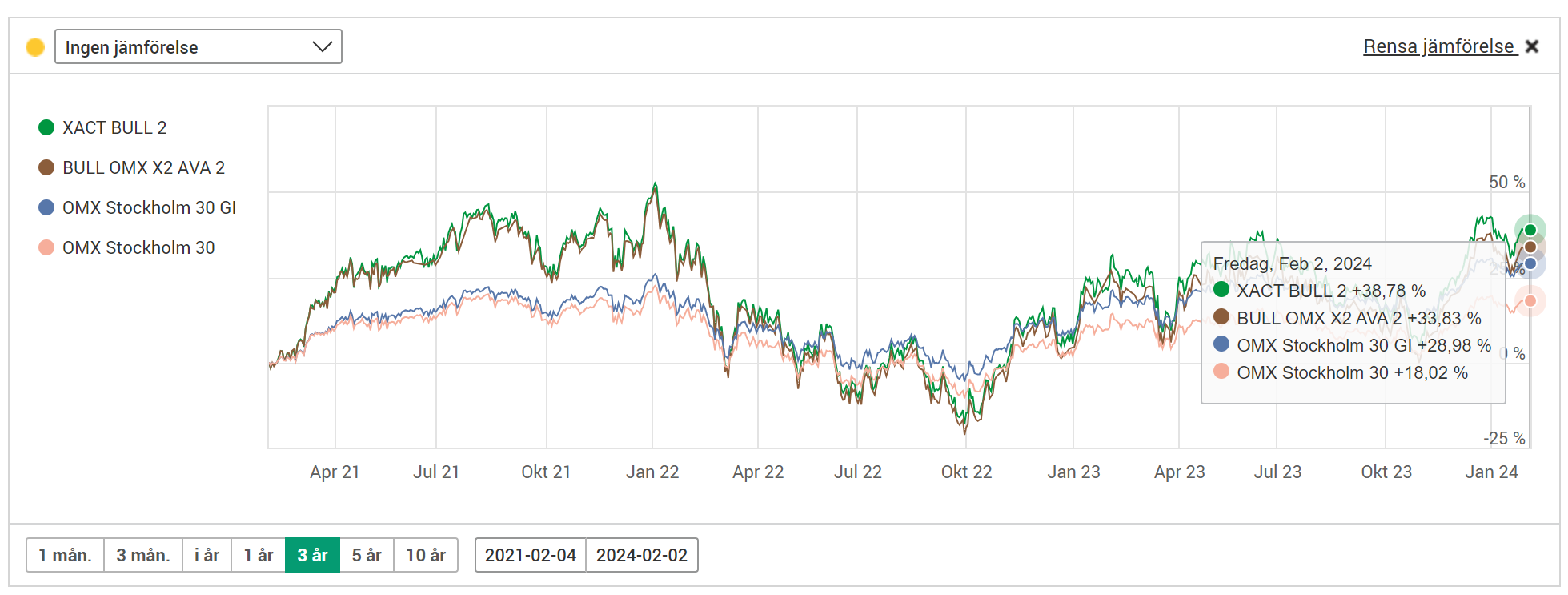 Försöker exemplifiera med XACT Bull 2 och Bull OMX X2 AVA 2. Båda är bull med hävstång två mot OMX Stockholm. XACT Bull 2 är en ETF och Bull OMX X2 AVA 2 är ett certifikat.