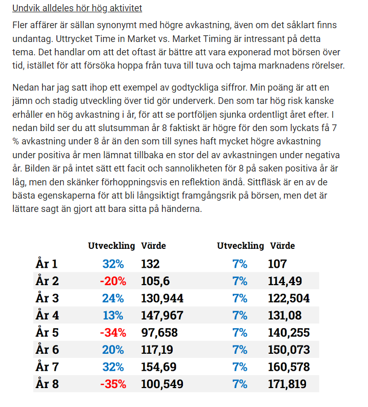 Här läser vi det han skriver fundamentalt olika. Jag läser det som att "Om du får 5, 7 10 eller 22 procent avkastning har inget att göra med att du lägger mer eller mindre tid. Det finns alltså inte en platå i ditt sparande där du efter att ha nått 10 procent avkastning så slutar effekten och du måste bli mer aktiv för att nå ytterligare avkastning. Jämför med träning där om du slutar lägga på vikt för att öka din styrka eller lägger mindre tid på din träning så når du en platå i din utveckling. Jag läser inte in att du alltid kommer ha en exponentiell utveckling i ditt resultat och att börsen i oändlighet kommer avkasta positivt. Jag tycker Jan belyser detta genom meningen som efterföljer.