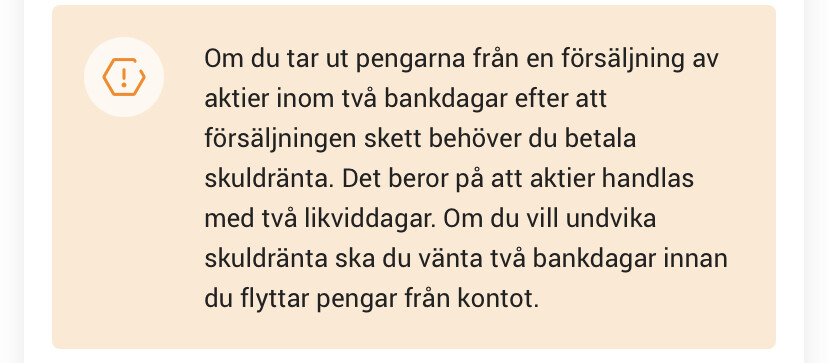 Jag har haft avanza auto på ett KF. I slutet på förra veckan så sålde jag av alla fonder, stoppade auton, eftersom jag ska flytta över pengarna till Lysa istället. Idag har försäljningen gått igenom, och pengarna står som “tillgängliga”, så jag tänkte att jag skulle flytta dom. Denna skylt kommer upp, och jag fattar inte om detta är en standard aning, eller om den gäller “enskilda aktier” eller om fonder ingår i detta, så att jag därför ska vänta ytterligare två bankdagar med att flytta pengarna?