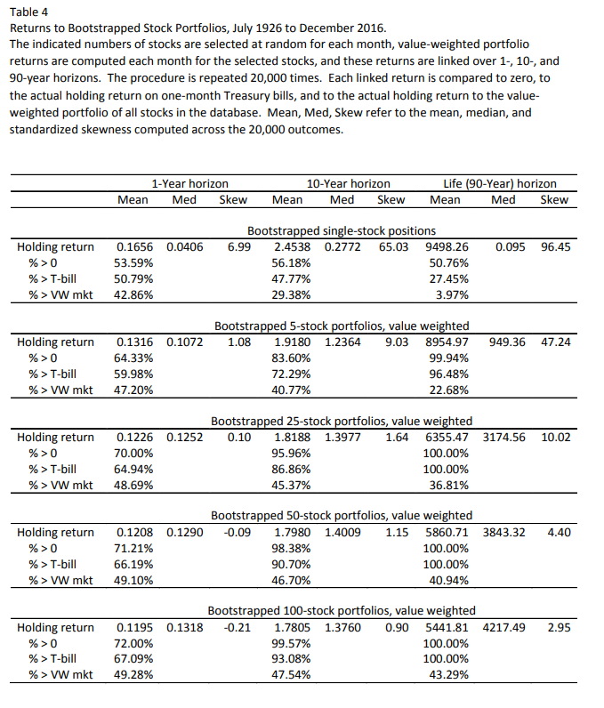 When focusing on stocks’ full lifetimes (from the beginning of the sample in 1926, or first appearance in CRSP, through the 2016 end of the sample, or delisting from CRSP), just 42.6% of common stocks, slightly less than three out of seven, have a buy-and-hold return (inclusive of reinvested dividends) that exceeds the return to holding one-month Treasury bills over the matched horizon. More than half of CRSP common stocks deliver negative lifetime returns. The single most frequent outcome (when returns are rounded to the nearest 5%) observed for individual common stocks over their full lifetimes is a loss of 100%.