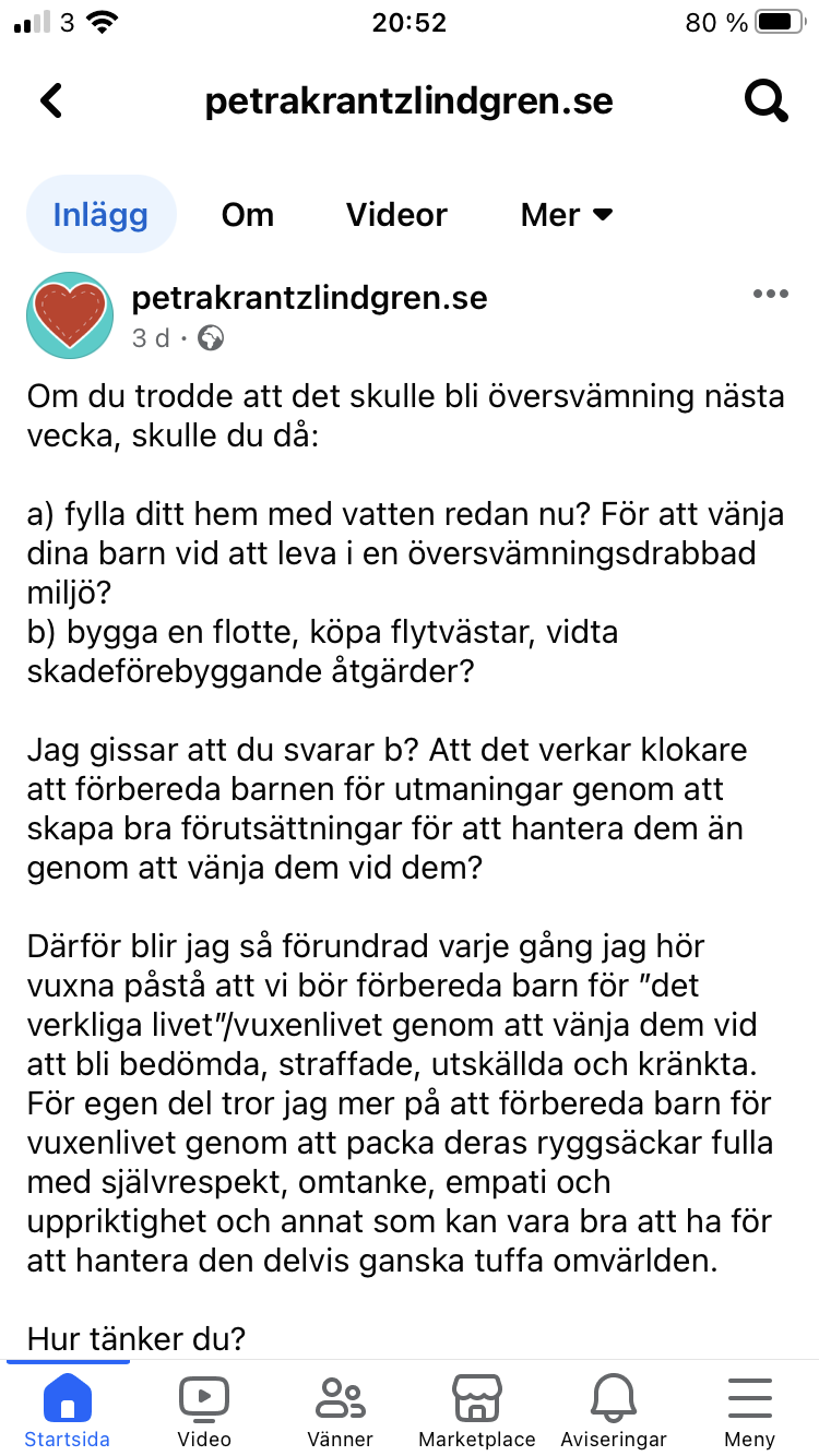 Tycker nog tyvärr att ett sånt där inlägg är rätt polariserande. Det finns väl ändå inte många föräldrar som förespråkar att barn ska utsättas för att bli “straffade, utskällda och kränkta”.