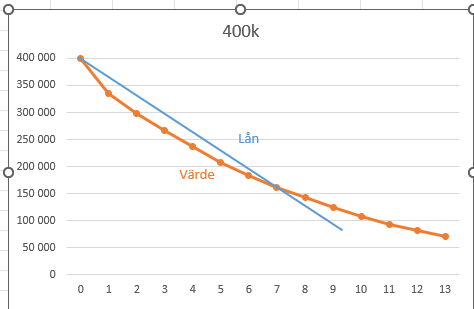 OBS! Efter År2/3 så kommer bilens värde vara lägre än lånet. Men håll ut, efter År5-6 så möts dessa kurvor igen och du kan sälja bilen och betala av kvarvarande lån. Så kör du en ny runda igen.