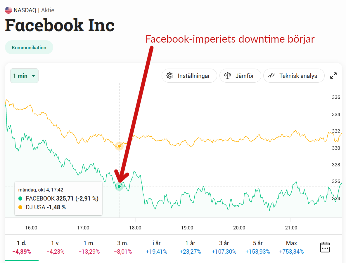 Det som snarare påverkade var att tech under aktuell dag gick knackigt överlag. Precis som du ser själv i prisdatan började FB INC gå ned långt innan FB-nätverket gick ned.