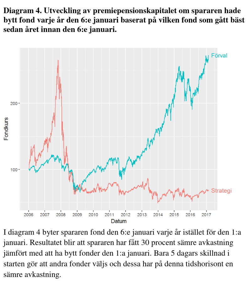 Tack @bspastikern det är intressant tycker jag att analysen går att göra och går att göra nu utan att vänta till nästa år. Det går att stega igenom historien och se vilken strategi hade vunnit. En naiv idé är att vikta om portföljen en gång om året, en gång i månaden, en gång i veckan eller en gång om dagen, sälja gårdagens förlorare och köpa dagens vinnare. En gång skrev jag ett dataprogram som gjorde detta i en sandlåda för en virtuell marknad, vars priser var från verkliga köp och sälj, men kapitalet var fiktivt. Jag lät programmet logga in, läsa tabellen med senaste procentuella vinnare, köpa de nya vinnarna, sen sålde jag manuellt själv förlorare, dvs “cut-your-losses”, ganska snart var mitt konto nr 1 i ledartabellen och ingen ville tävla mera mot mig. Det är en naiv strategi som kan tålas att prövas. Det finns ju även väldigt mera komplicerade strategier (Baum-Welch algoritm osv.) som försöker estimera ganska kortsiktigt vad blir nästa observation givet följande historik, och historiken kan vara ganska kort (ca 30 observationer) men det funkade när beslutet var rätt i 51% av fallen. Verkar ganska dåligt beslutfattande som är felaktigt i 49% av fallen, men det förefaller vara avgörande för vinst om man bara är lite bättre än slump. Ofta är man sämre än slump.
