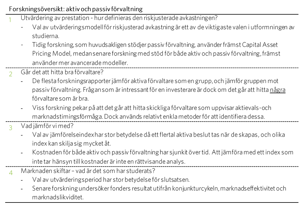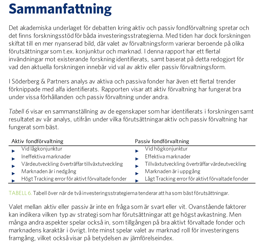 Det intressanta är också vinklingen att det finns perioder då aktivt är bättre och andra där passivt nämns som bättre. Dessa perioder och motivering verkar bara vara en omskrivning för att aktivt förvaltning ger lägre risk (och lägre associerad avkastning). Det står att aktivt presterar bättre i sämre tider och passivt presterar bättre i bättre tider.