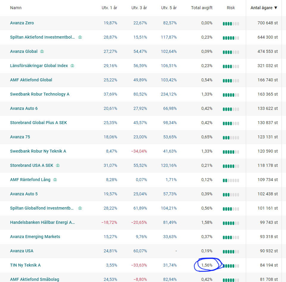 Men! TIN Ny Teknik på plats 18: 1.56 i avgift och +80.000 ägare. Har de haft ngn framgångsrik marknadsföringskampanj på TIN? Det som jag undrar är väl lite vad som avgör vad vilken fond folk väljer. Och varför just denna är med. Relativt blygsam avkastning också.