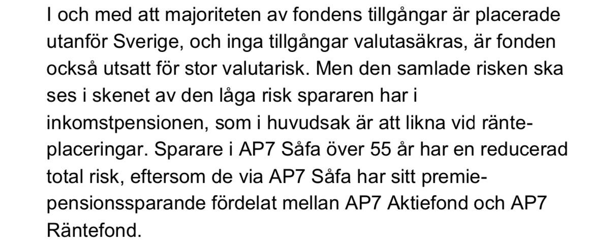 Förstår fortfarande inte hur det inte kan vara någon valutarisk med att äga en globalfond, när valutakursen påverkar avkastningen. Nedan taget från AP7: