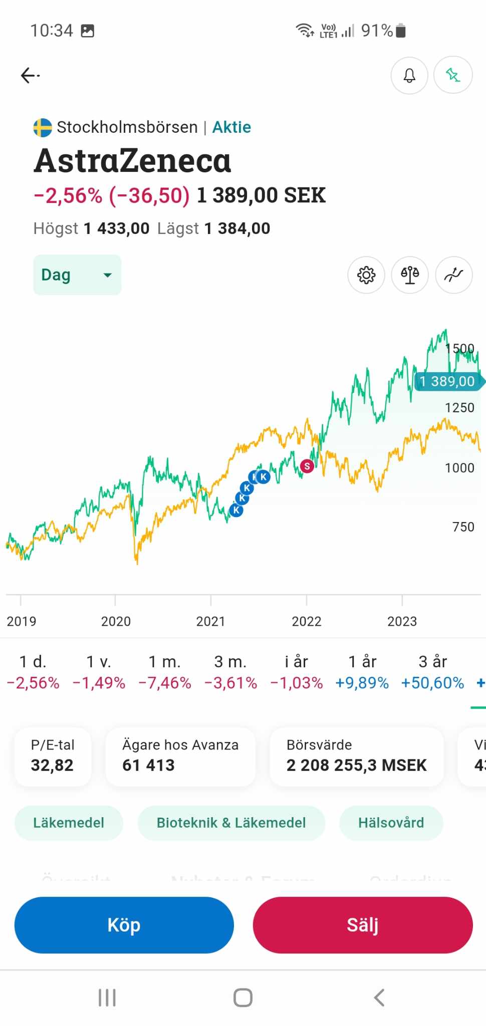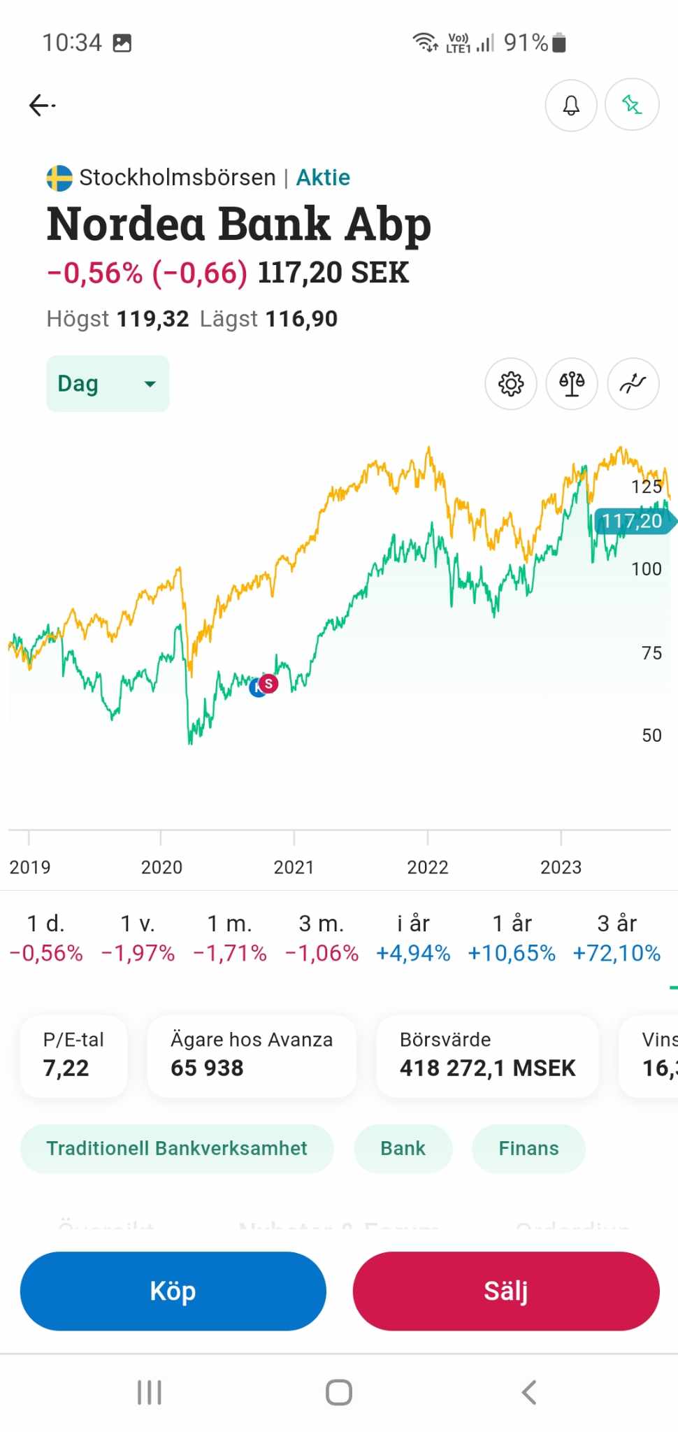 Jag har aktier i många branscher och tycker inte att det känns särskilt riskfyllt. Just nu har jag kanske lite för mycket bankaktier. Mina största innehav är Avanza och SHB. Avanza har gått bra och jag sålde av en del, ungefär 1000 aktier, nära toppen så det har hittills varit en bra investering. SHB började jag köpa för nästan 30 år sedan. Inte jätterolig kursutveckling men en stadig utdelare genom åren.
