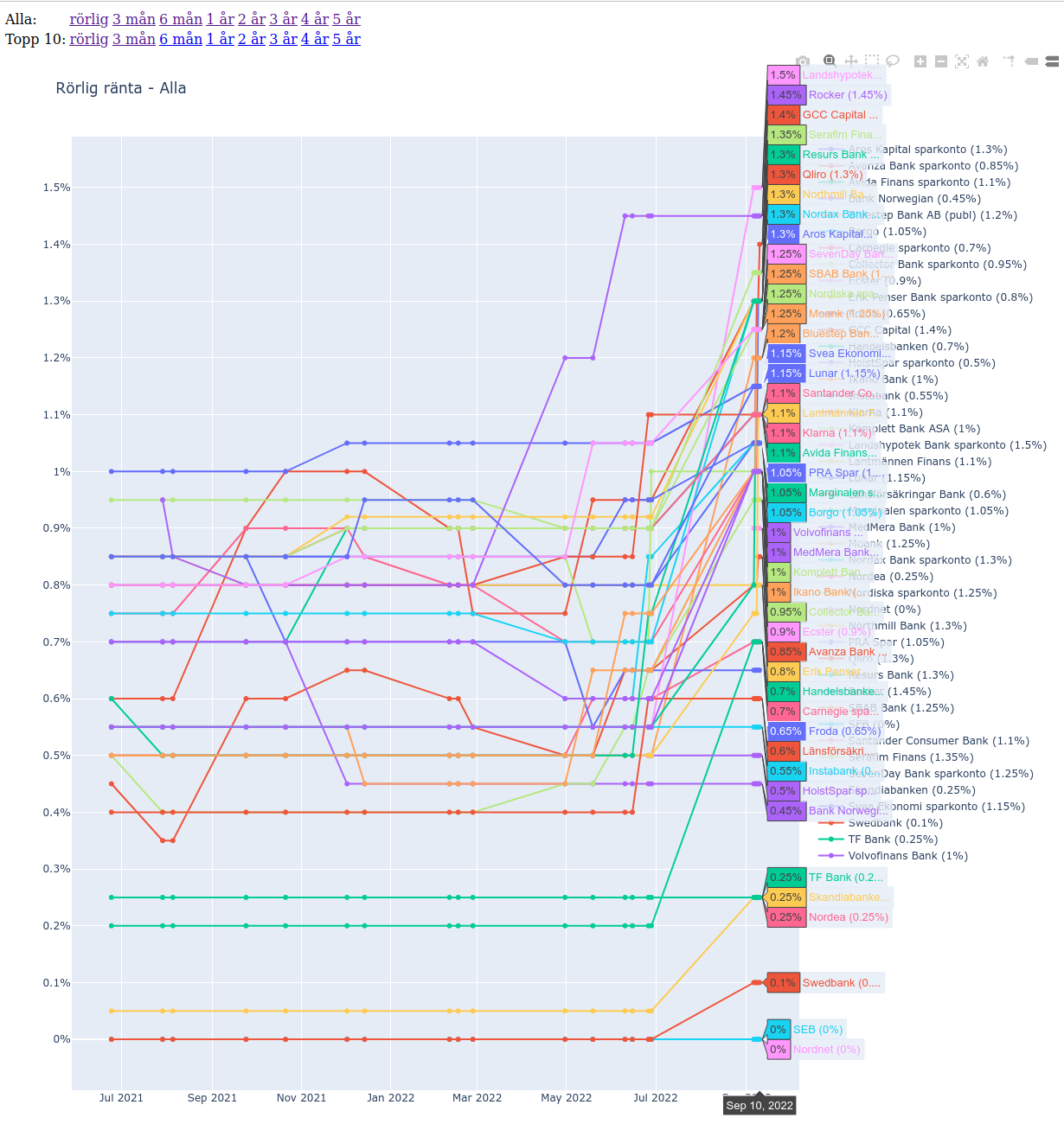När man visar alla konton med rörlig ränta så blir det ganska grötigt, men man får en topplista om man för markören över. Man kan också dubbelklicka på ett namn för att bara visa en viss bank och enkelklicka för att visa/dölja.