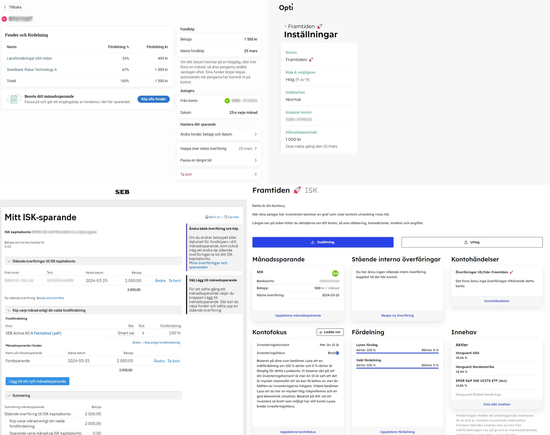 SEB sparandet började efter köpet av bostaden för 1,5 år sedan mot förmånen på några %-enheter på bolånet. Dyr avigt annars på 1,83% tyvärr, men ligger på +12% sedan start. Avanza och Lysa är relativt nya tillskott pga låga avgifter.