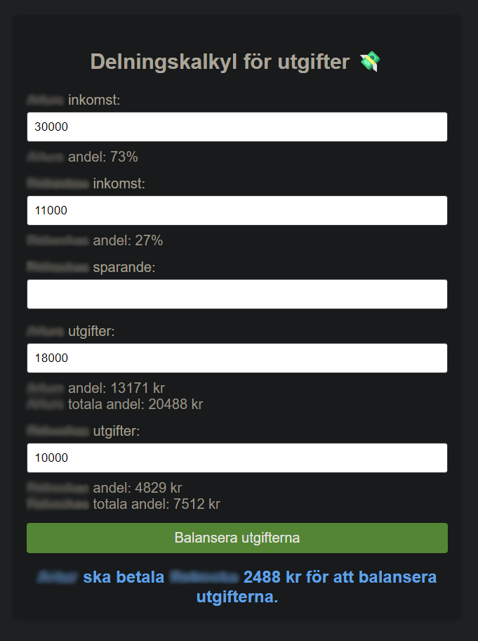 Jag har skrivit ihop en snurra i Google Kalkylark som en app, som balanserar ut våra utgifter proportionellt baserat på månadsinkomsterna, så hon inte behöver känna sig alldeles för ekonomiskt utsatt. Dvs jag står för ungefär 75% av hushållet utgifter och swishar över en slant på mellanskillnaden för hennes utgifter.