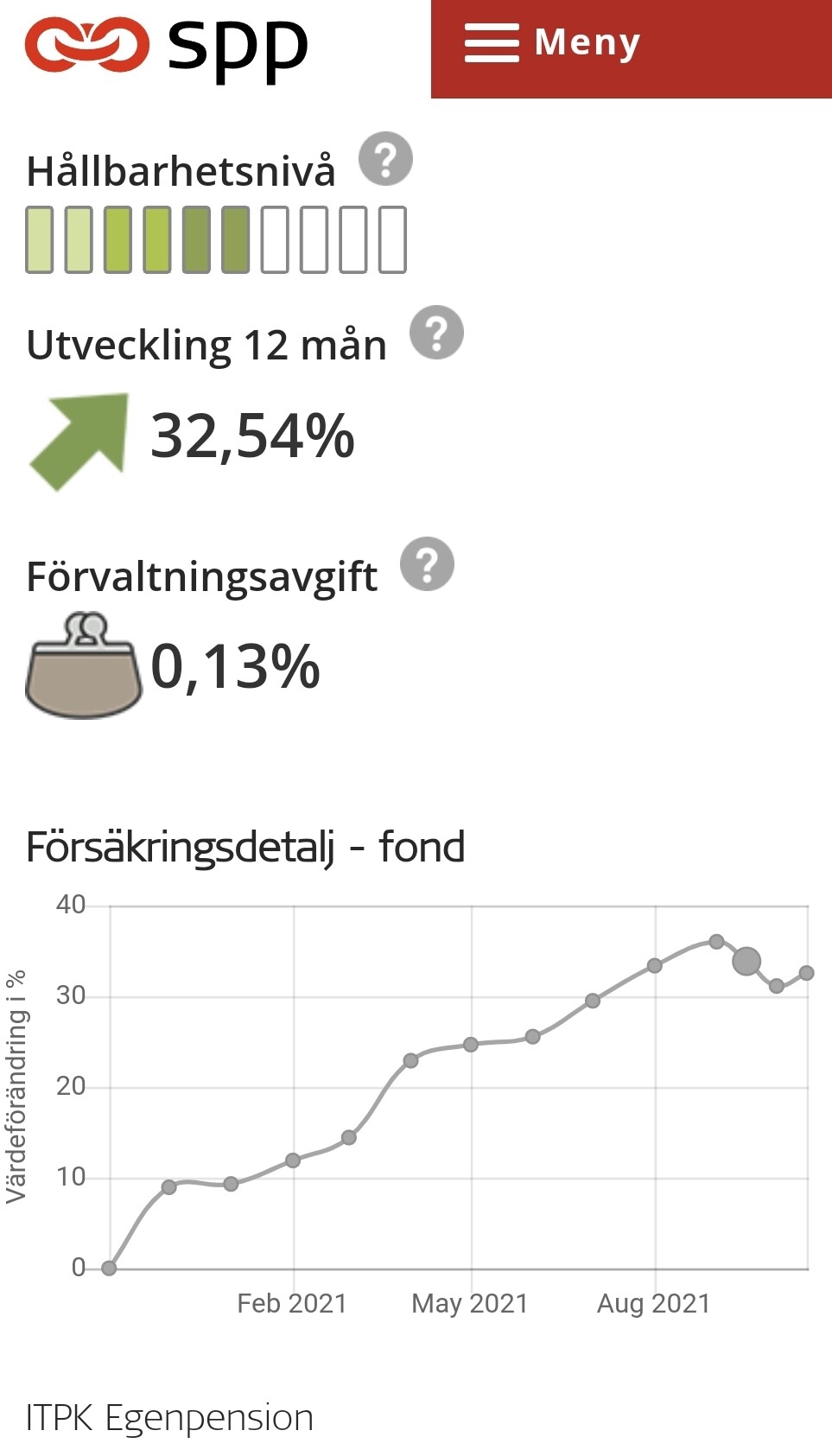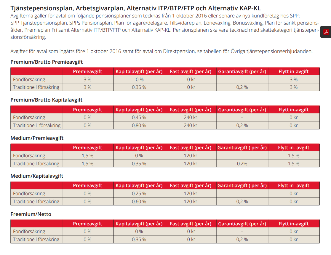 Jag har tjänstepension ITPK hos SPP ( Kollektivavtal: Privatanställd tjänsteman (ITP2) ). Den verkar ha 0 kr och 0 % avgifter förutom förvaltningsavgiften.