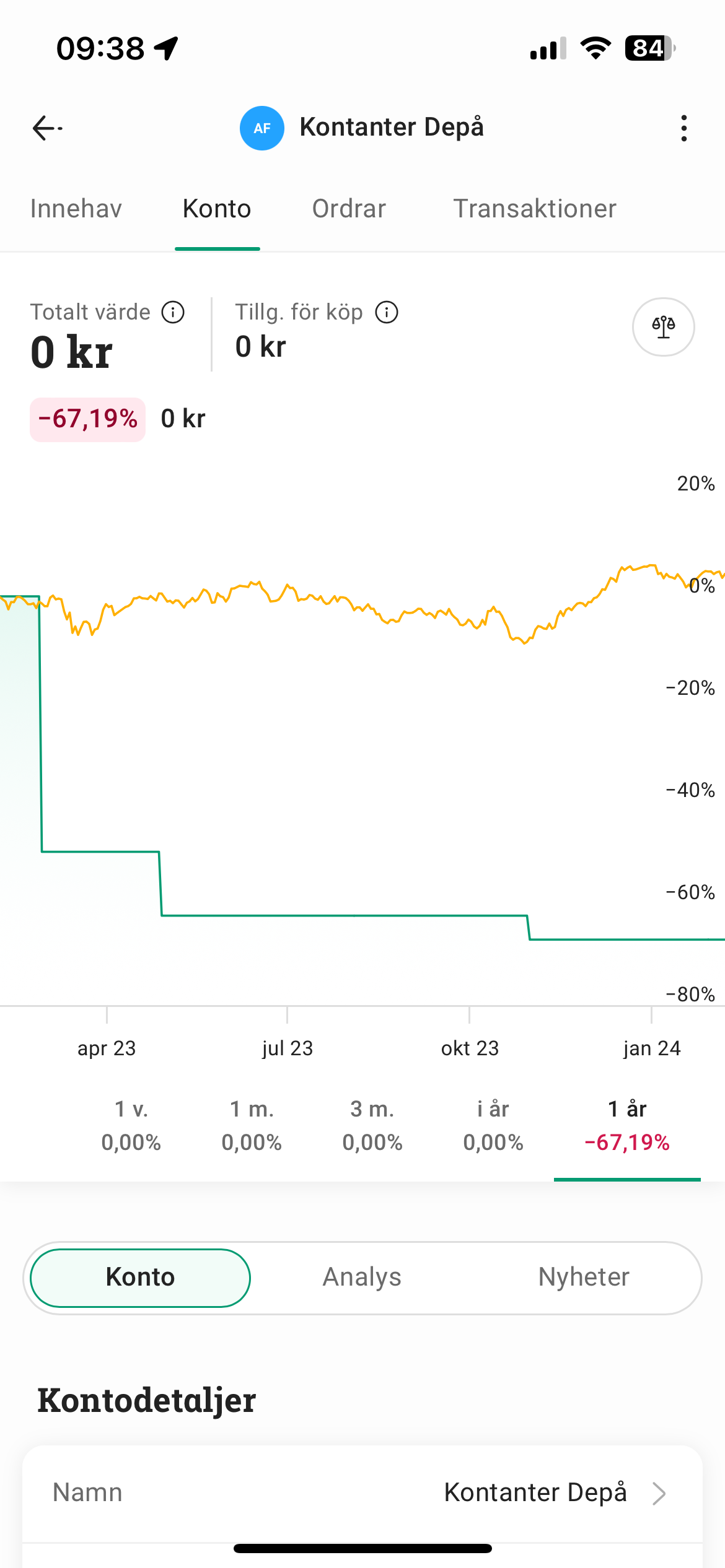 Att det inte blir +/- 100% är att det ligger några ören kvar på kontot som inte syns i skärmdumpen nedan pga avrundning. Detta är alltså ett konto som har ett värde på 0kr (avrundat) och som gått -67.19% på ett år, men det är +/- 0kr. Det har skett tre gånger på detta konto senaste 12 månaderna. Hur detta slår på konton med tillgångar är svårare att kontrollräkna, och lika så dess inverkan på totala procentsatser för kontot. Men lita på Avanzas procentsatser hade jag inte gjort.