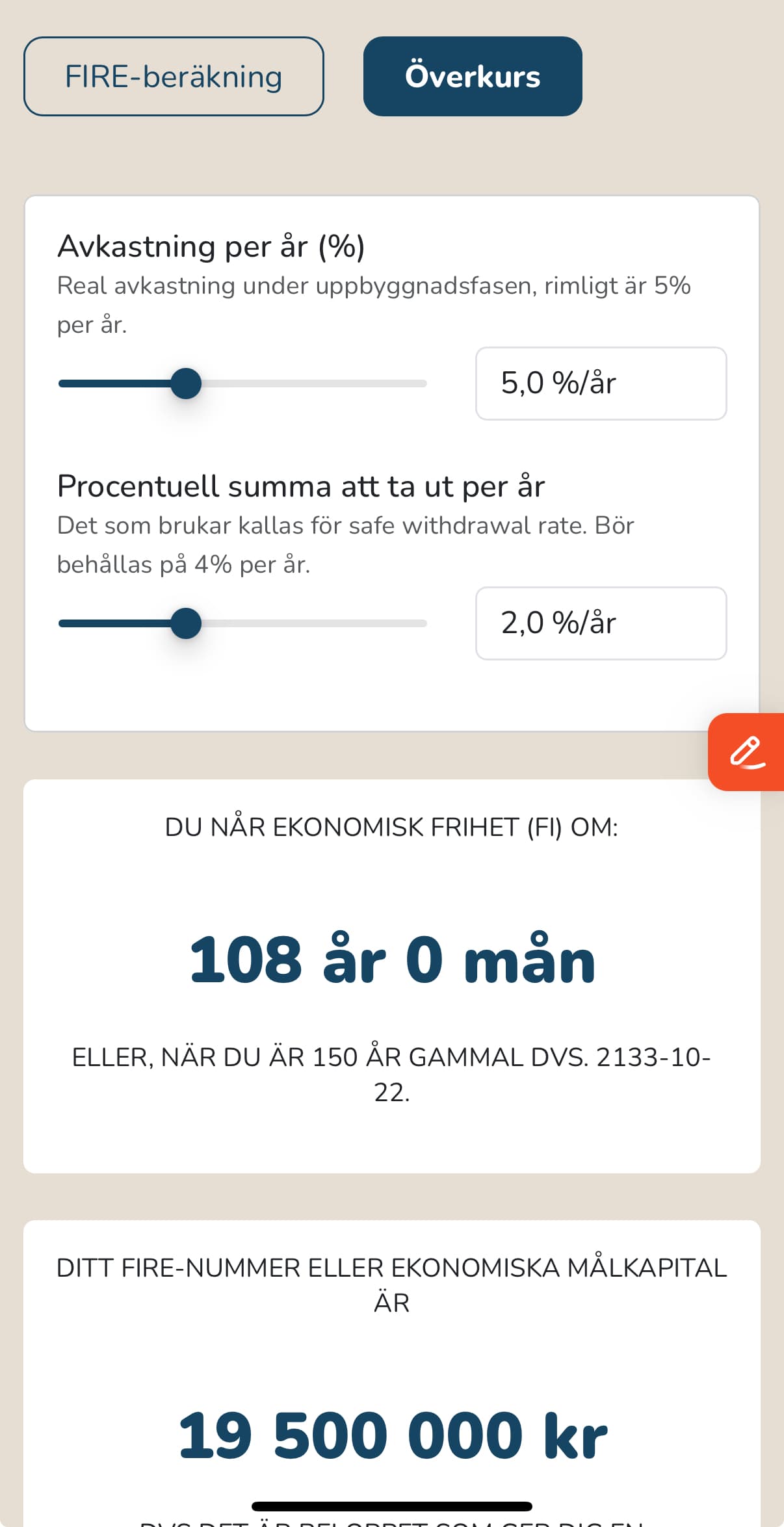 Redigerat; Nu tror jag att jag förstår, du menar att genom att sätta den utgiftsnivå kan jag se hur stort firekapitalet bör vara. Det är kanske någon som vill använda räknaren enbart för det men jag tänkte att poängen var att man samtidigt såg hur lång tid det tar att spara ihop detta.