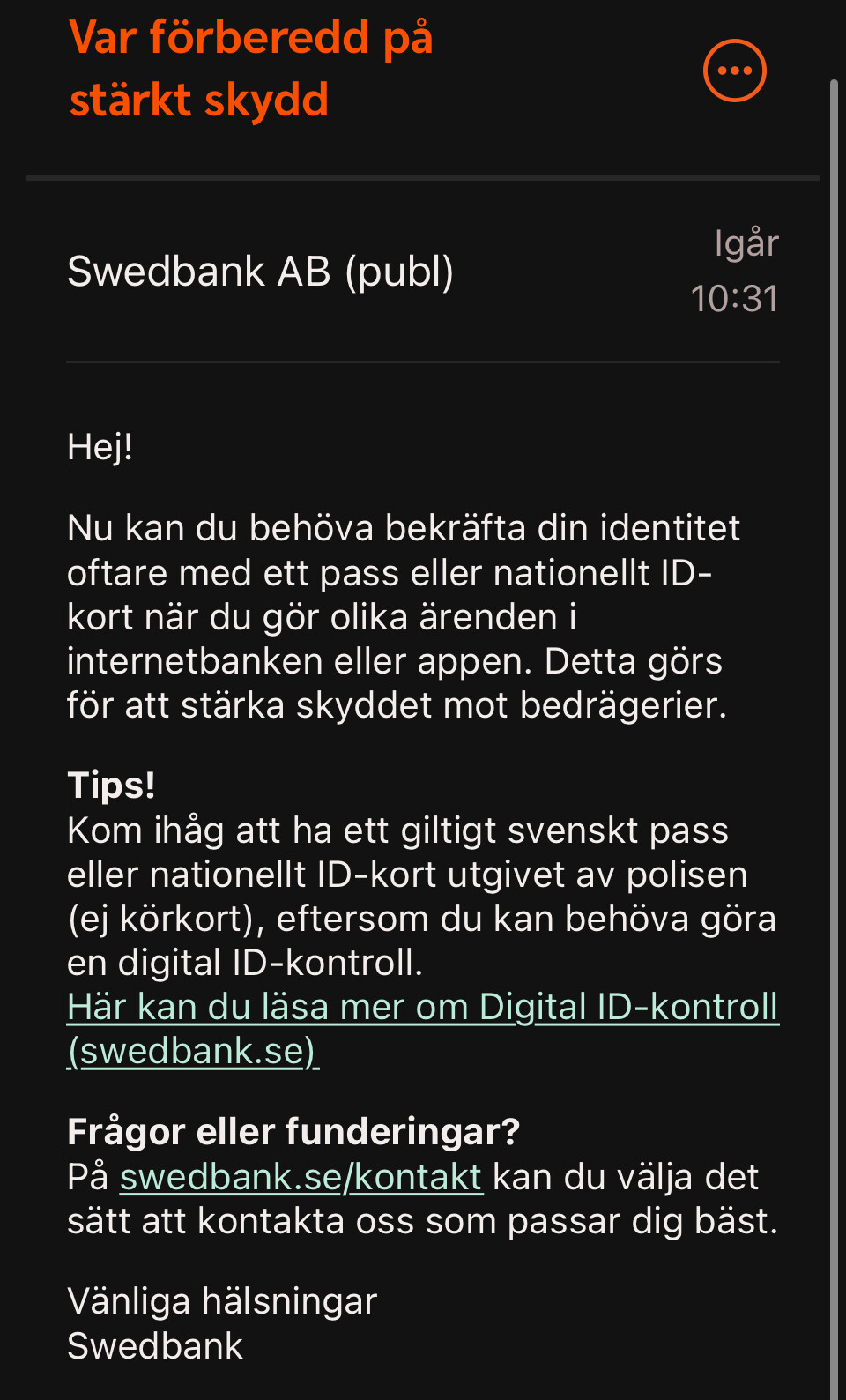 Mitt pass har gått ut och jag fick strul med Bank-id efter ominstallation o batteribyte på iPhonen. Var tvungen att ta mig till Swedbanks kontor för att få nytt Bank-id. Om något strular med telefonen igen, så har jag passet (som jag får om ca en vecka) att identifiera mig med om jag behöver nytt Bank-id utan att gå in på fysiska bankkontoret.