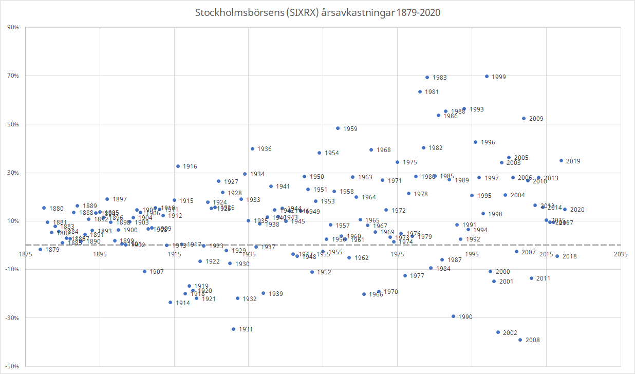 Är det någon som vet vilken årlig snitt avkastning Stockholms börsen har på lång tid tillbaka?