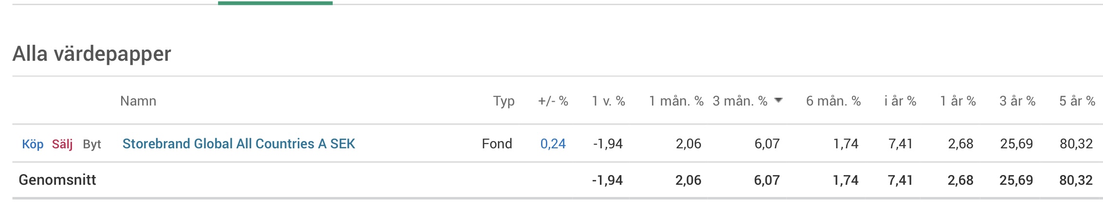 Om jag lägger in dessa i en bevakningslista på Avanza. Samt jämför med Storebrand Global som inkluderar tillväxtmarknad så är utfallet olika.