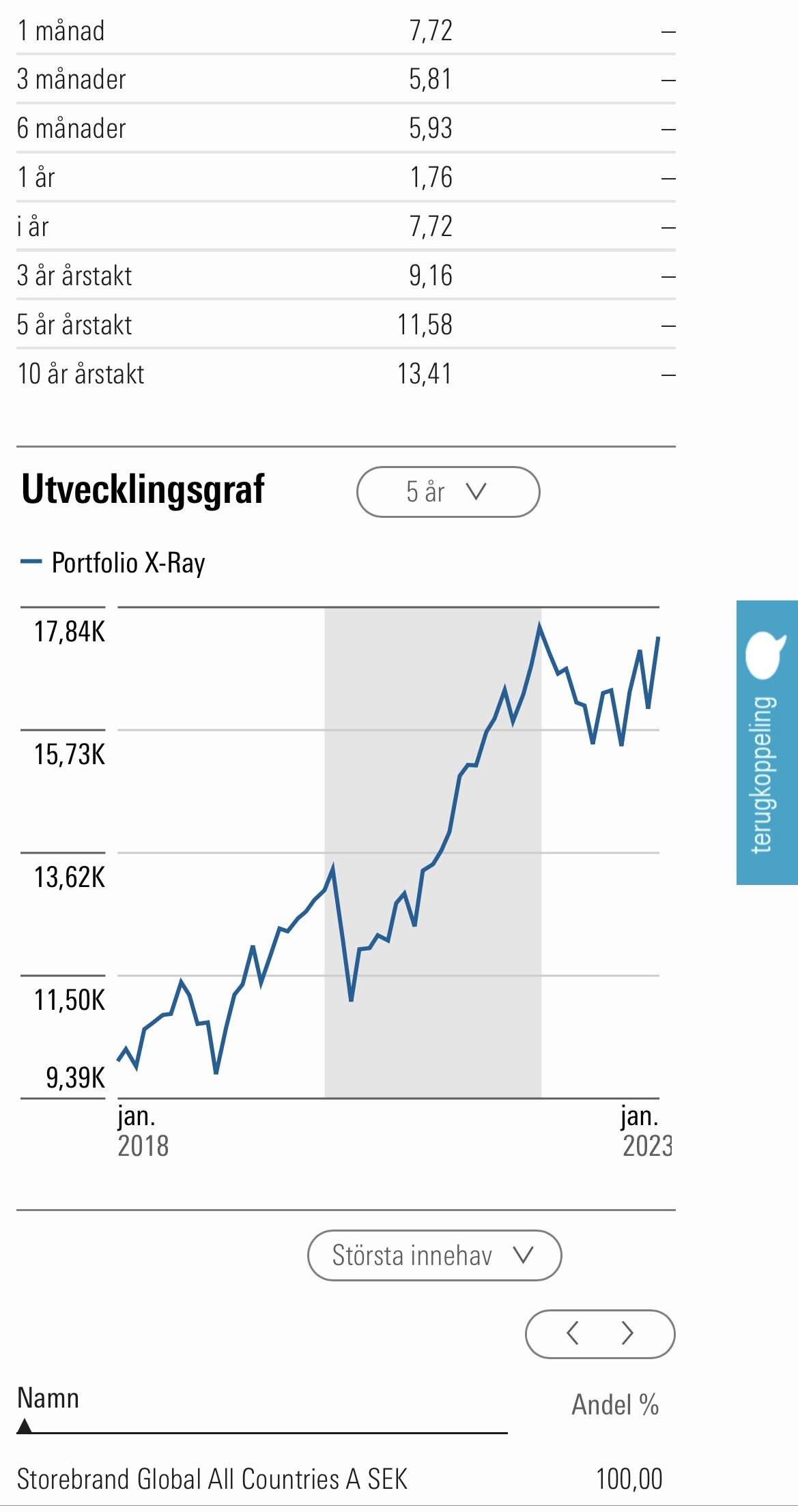 Tack för tipset. Kunde gräva fram funktionen i Morningstar och de följer i princip varandra. 3-6 månader har gått bättre för Storebrand men i övrigt har Basportföljens motsvarande del tagit rygg på Storebrand.