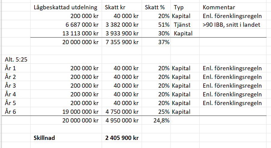 3:12 reglerna och K10 gäller. Enligt det jag läst in mig på kring K10 kan jag plocka ut knapp 200 k till 20 % skatt per år. Utdelning däröver beskattas i tjänst ~52 % upp till 90 pbb, därefter som kapital 30 %. Om jag då tar ut säg 20 MSEK så blir det 6,39 MSEK x 0,52 + 13,61 MSEK x 0,3 = 7,4 MSEK i skatt. Total skattesats då 37 % (bortsett från de 200 k). Större summa i utdelning ger lägre skattesats.