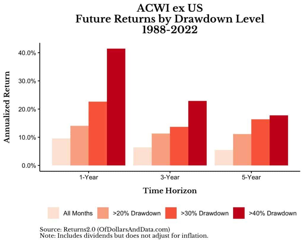 As you can see, the median annualized one, three, and five-year returns when the market is down by >20% or >30% is nearly identical to the returns during all months. This suggests that there is no added benefit of investing more during drawdowns of this magnitude.