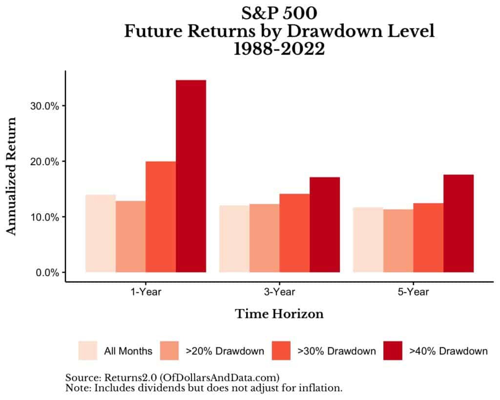 However, once the market has declined by 40% (or more) from all time-highs, everything changes. At this point, it seems like the benefit of doubling down is quite large. In particular, following a 40%+ decline, the S&P 500 tends to return 25% over the next year compared to 13% (across all months) and 12.8% annually over the next five years compared to 11.1% (across all months). This suggests that there is a huge benefit to “buying the dip” during the biggest of declines.