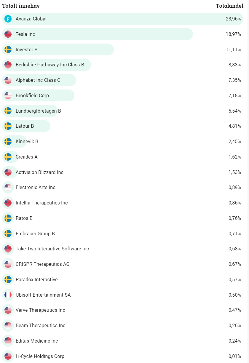 Du kan skönja global index, svenska investmentbolag, amerikanska konglomerat, samt mina egna bets bestående av Tesla, crispr-bolag och dataspelsbolag. Tillsammans med sparkonto utgör de mina fem pelare. Risken i min portfölj är hyfsat stor pga 92 % aktier, men jag siktar på >15 % cagr och bättre än globalt index. Jag har sparat på Avanza sedan 2005 eller så, men började fylla på med sparpengar från lön ca 2009.