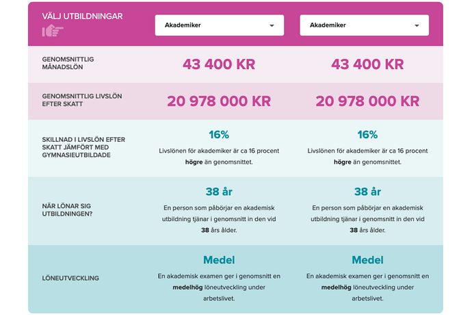 Jag tycker bra utbildning är värd stressen och statistiken visa också det. Vad jag tycker är lite tråkig är att akademiska utbildningar är bara “fulltid” här, jag kommer från Tyskland och gjorde en ekonomisk utbildning efter gymnasiet i ett stort industriföretag 2,5 år och fått typ 10 000kr lön under utbildningen, sedan ta företaget vanligtvis över dig och jag gjorde min bachelor (typ civilekonom) på kvällsskolan med en normal heltidsjobb med ingångslön typ 30 000kr. Så jag började tjänar pengar och pensionsrätter direkt med 18 år och pluggade samtidigt utan att behöver ta skulder/CSN. Nu är det kanske inte så enkelt med barn att jobba 40 timmar och pluggar 20-25 timmar per vecka, men det skulle vara bra om man kan utbilda sig samtidigt som man jobba tycker jag. Det finns även duala utbildningar i Tyskland var man göra en klassisk utbildning i företag samt bachelor tillsammans, ta ca. 3,5 år och efter det har man utbildning + bachelor + 3,5 år arbetserfarenhet och lön/pensionsrätter.