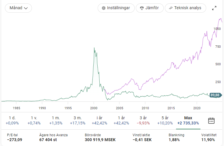 Utveckla vad? Det där är Eriksson B aktie och dess utveckling jämfört med OMX 30 GI. De kanske utdelar kapital men värdet -4,5% på 10 år och -9,4% på 3 år. Deras alla patent leder inte till något som omsätts i något marknaden uppskattar.