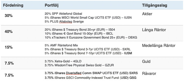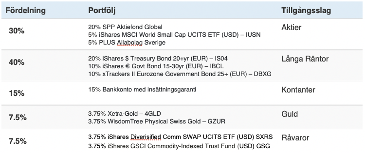 Jag läste inlägget från Anton här ovan där han hittat svenska alternativ. Finns det bättre möjligheter idag att sätta ihop en svensk version av Ray Dalio AWP? Någon här som har en sådan portfölj eller har idéer på ett bra innehåll?
