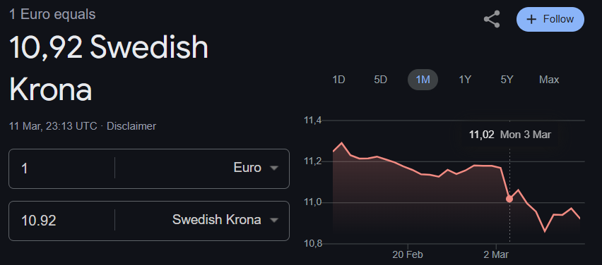Har växlat lite SEK till Euro och satt in på mitt Spanska konto, har ju ett hus där nere så det känns bra att känna växla in SEK billigare än jag kunnat sedan 2021.