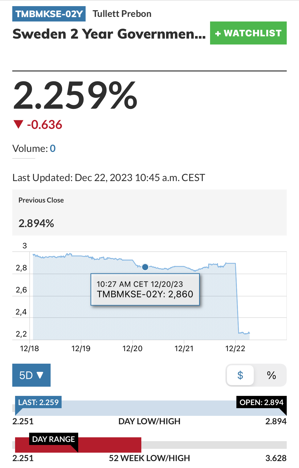 Ja, det är otvivelaktigt fel. Realtidskurs på ansedda Marketwatch säger tex 2,86% TMBMKSE-02Y | Sweden 2 Year Government Bond Overview | MarketWatch