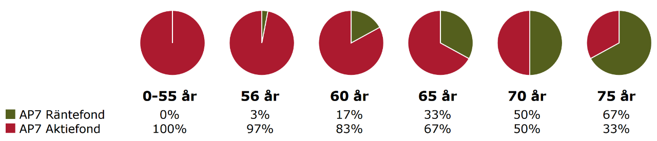 AP7 SÅFA är ju en stående rekommendation på forumet då det är en av den bästa fondlösningarna. För dig innebär den ju en kombination av AP7 Aktiefond och AP7 Räntefond. De flyttar ca 3 % per år från 55 års ålder från aktie-delen till räntedelen.