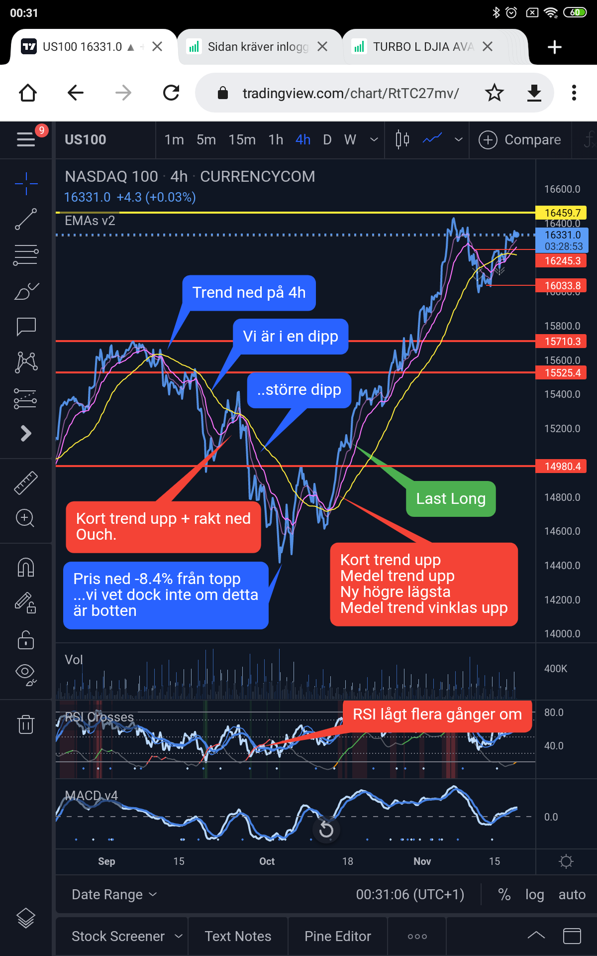 Nasdaq 100 på 4h, senaste dippen Det går inte att skriva allt som jag ser där för det skulle bli väldigt långt Medelvärden på bild är EMA10, 21 samt SMA50