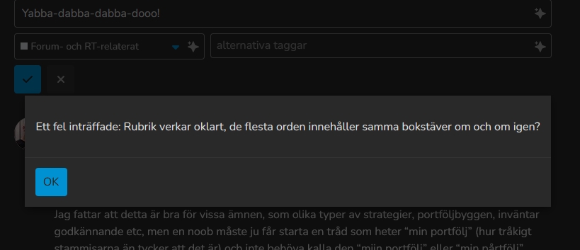 Jag fattar att detta är bra för vissa ämnen, som olika typer av strategier, portföljbyggen, inväntar godkännande etc, men en noob måste ju får starta en tråd som heter “min portfölj” (hur tråkigt stammisarna än tycker att det är) och inte behöva kalla den “miin portfölj” eller “min pårtfölj”.