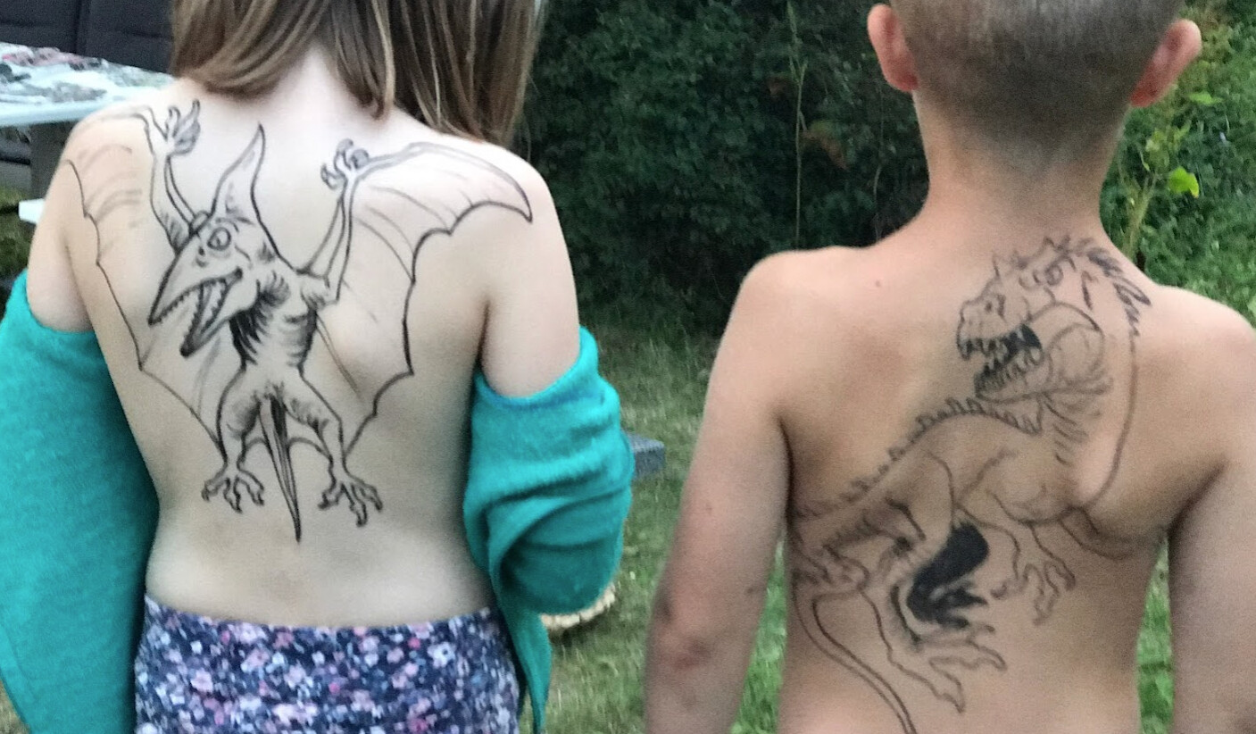 PS. Kan dock säga att en av våra kompisar är en ansedd tatuerare. Här skissade han på ett par minuter med en biltema-penna på Frejas och sin sons rygg på en semester för några år sedan.
