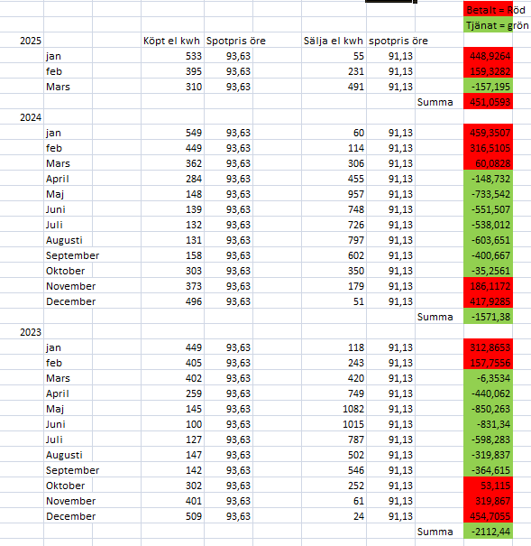 Perioden januari 2023 till och med mars 2025 har jag fått betalt 226 kr mer än jag betalt för el.