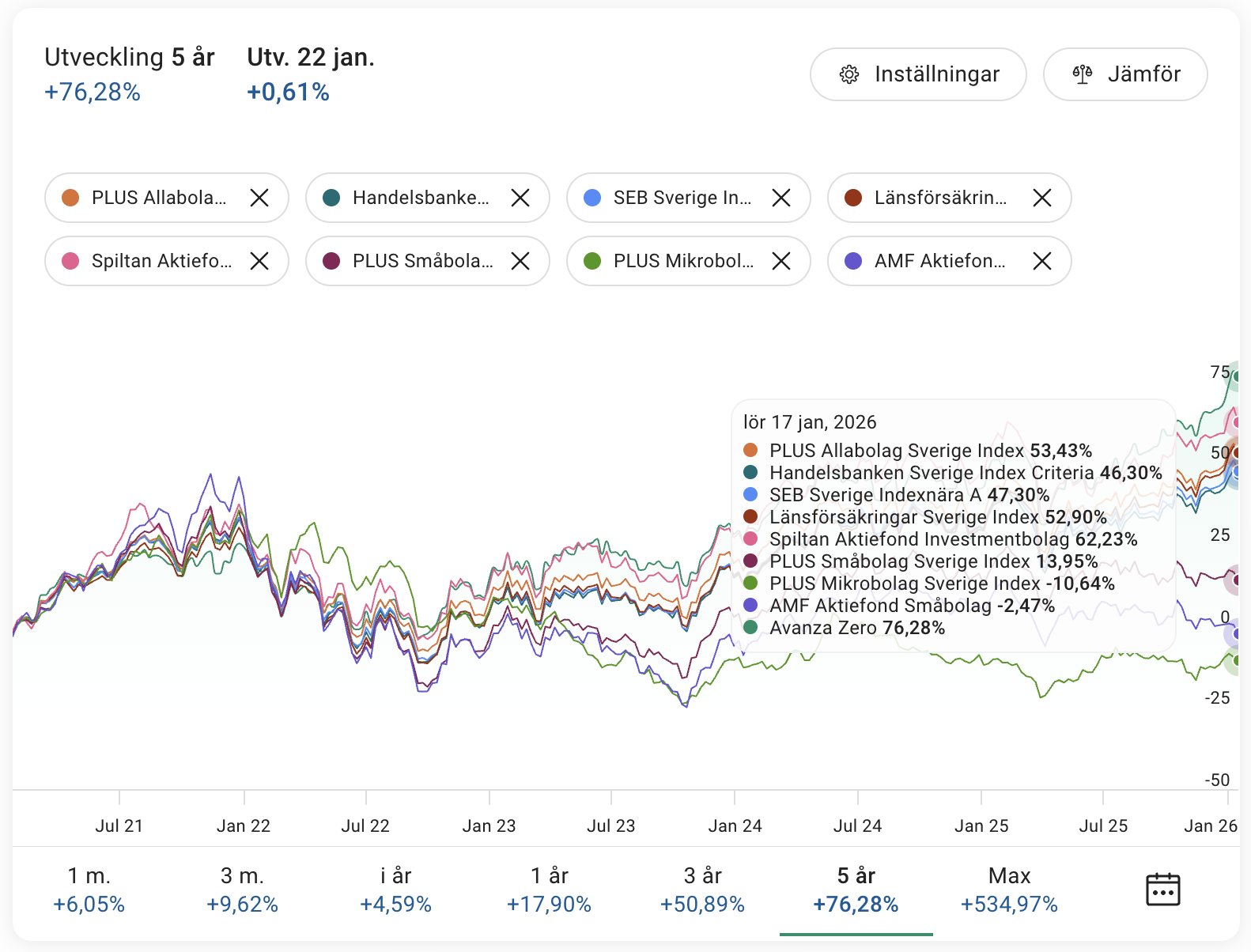 I USA/Internationellt har vi sett att stora bjässar som Nvidia, Microsoft, Apple m.m. gått bättre än småbolag de senaste 5+ åren. Samma sak även i Sverige, vilket syns på Avanza Zero, som endast innehåller de 30 största svenska bolagen, i grafen nedan.