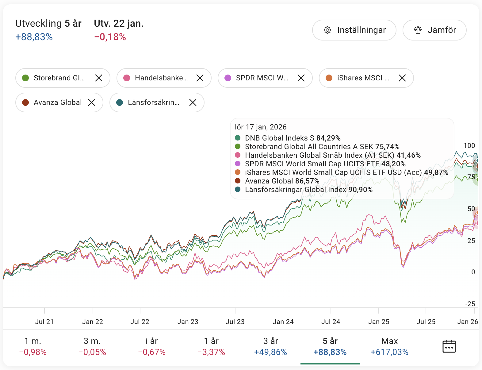 En grej värd att tänka på är att svenska småbolag ofta har begränsad adresserbar marknad jämfört med amerikanska/globala - många är nischade mot Norden och har svårt att skala. Så global exponering (typ Avantis) känns mer vettigt än ren svensk småbolag.