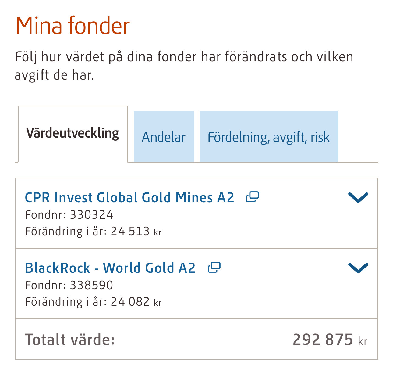Jag tänkte en gång att jag ville ligga 100% mot guld. Dom här två fonderna var väl det närmsta jag kom.
