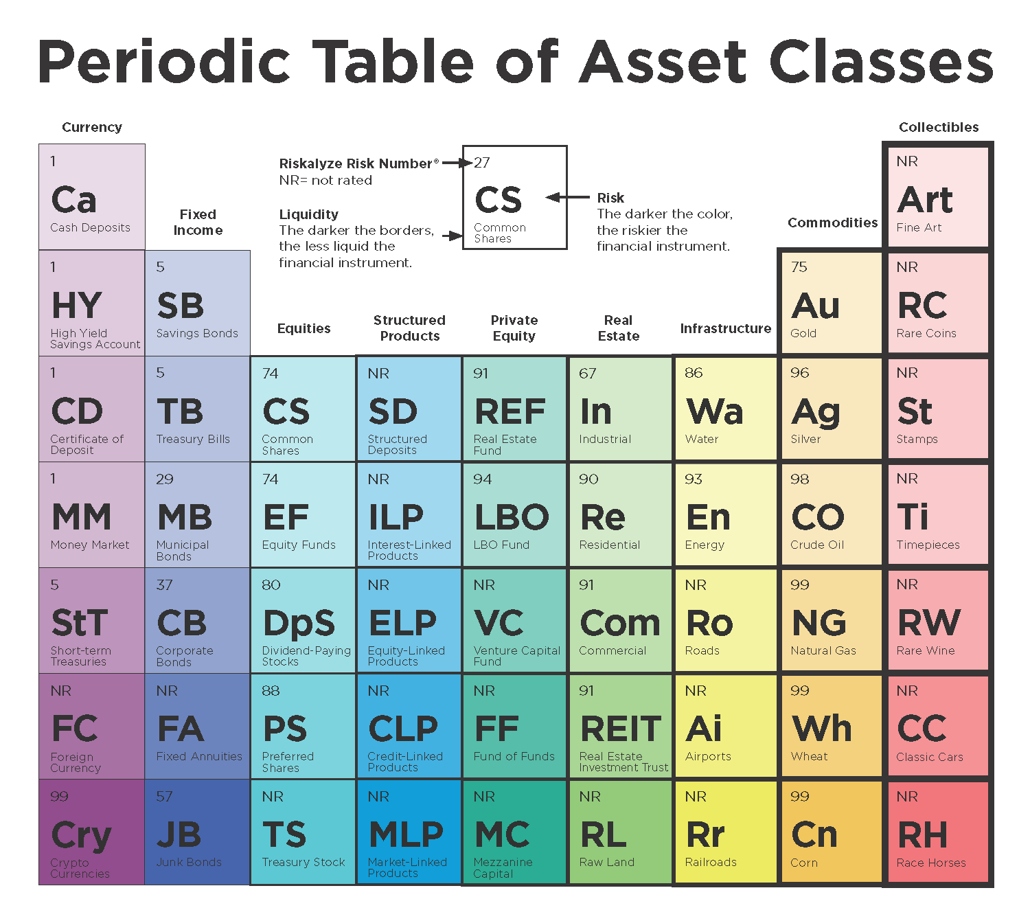 There are nine asset classes grouped in columns. From left to right, the financial instruments in columns are arrayed from most liquid to least liquid. This trend maps to instruments associated with financial assets and instruments having to do with real assets. The financial instruments on the left are most readily converted into cash without affecting their market price. The financial instruments on the right cannot readily be converted into cash without a substantial loss in value.